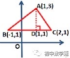 如上图,因为有边与坐标轴平行,所以这条边的长度,和这条边上的高就非常容易计算,底BC=2-(-1)=3,高AD=3-1=2,之后可以直接计算△ABC的面积。