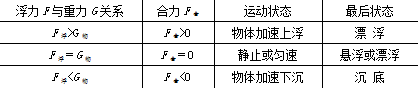 物体上浮或下沉,取决于它的重力G与所受到的浮力F的大小。具体情况如下表所示。利用这些关系,可以解决很多实际问题,应灵活应用。