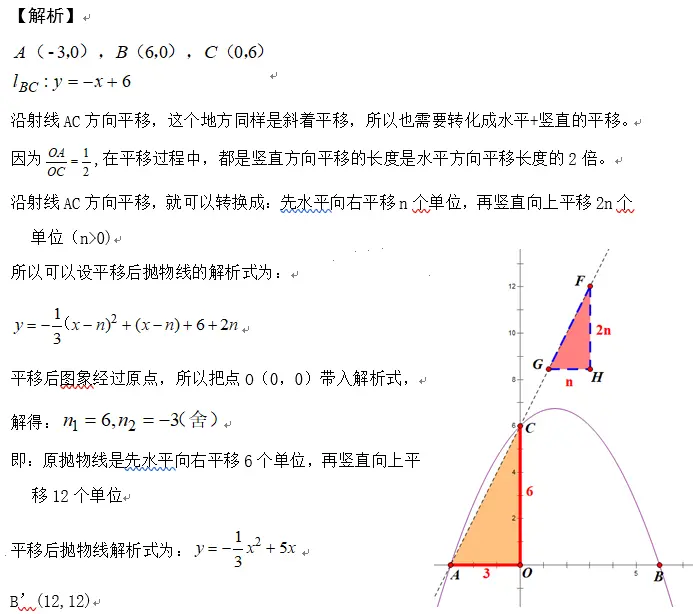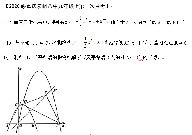 二次函数图象的斜着平移在19年重庆中考B卷26题第二问中出现过,最近八中的月考也出现了,如果第一次见到会比较慌张,不知道如何下手,实际上把这个单独拿出来看,就是一个简单的平移问题,用函数图象平移打方法处理就可以了。