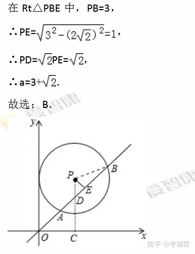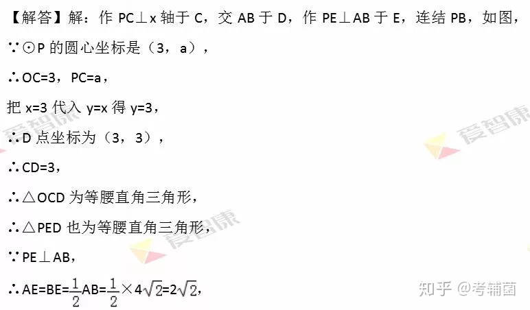 【分析】本题考查的是圆的垂径定理,同时也考查了勾股定理和等腰直角三角形的性质.我们可以做PC⊥x轴于C,交AB于D,作PE⊥AB于E,连结PB,由于OC=3,PC=a,求得D点坐标,判断△OCD,△PED的形状.由PE⊥AB,根据垂径定理得AE=BE=AB=2,在Rt△PBE中,利用勾股定理可计算出结果。