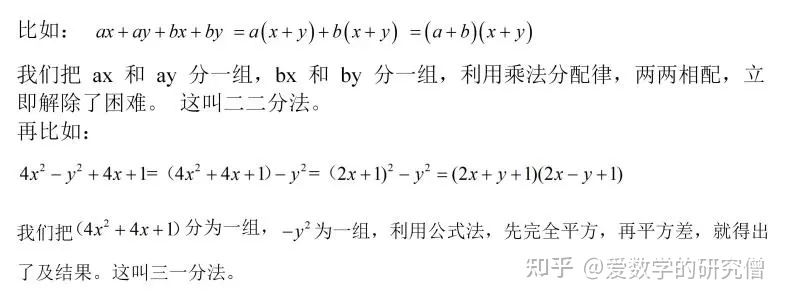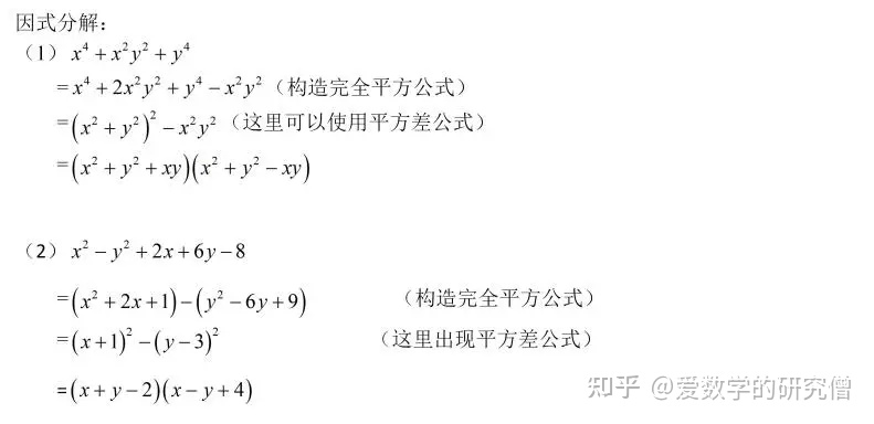 拆项添项法:为了分组分解,常常采用拆项添项的方法,使得分成的每一组都有公因式可提或者可以应用公式.