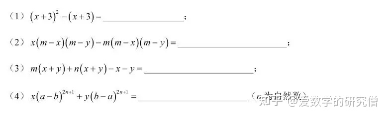 口诀:找准公因式,全家都搬走,提负要变号,变形看奇偶。