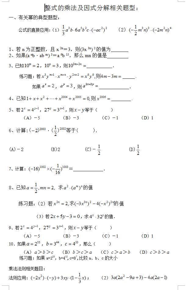 2023年初中数学整式的乘法及因式分解相关题型