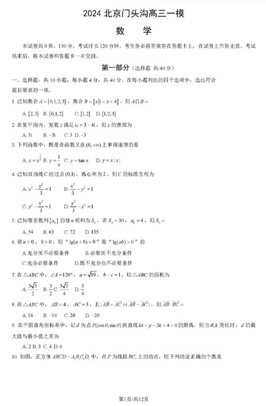 上一篇 : 2024届北京门头沟高三一模数学试题(图片版)