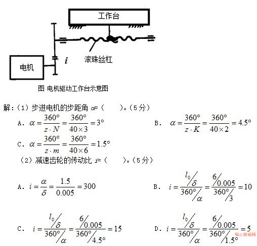 | 一、判断题(共 10 道试题,共 40 分。) 1. 步进电动机的转动惯量越大,同频率下的起动转矩就越大。( ) A. 错误 B. 正确 2. 气压式伺服驱动系统常用在定位精度较高的场合使用。( ) A. 错误 B. 正确 3. 传感器的静态特性是特指输入量为常量时,传感器的输出与输入之间的关系。( ) A. 错误 B. 正确 4. 无论采用何种控制方案,系统的控制精度总是高于检测装置的精度。( ) A. 错误 B. 正确 5. 驱动部分在控制信息作用下提供动力,伺服驱动包括电动、气动、液压等各种类型的驱动装置。( ) A. 错误 B. 正确 6. 气压伺服系统的过载能力强,在大功率驱动和高精度定位时性能好,适合于重载的高加减速驱动。( ) A. 错误 B. 正确 7. 永磁型步进电动机即使其定子绕组断电也能保持一定转矩,故具有记忆能力,可用于定位驱动。( ) A. 错误 B. 正确 8. 通常,步进电机的最高连续工作频率远大于它的最高启动频率。( ) A. 错误 B. 正确 9. 伺服电机的驱动电路就是将控制信号转换为功率信号,为电机提供电能的控制装置,也称其为变流器,它包括电压、电流、频率、波形和相数的变换。( ) A. 错误 B. 正确 10. 直流伺服电动机的机械特性是电机转速与其控制电压的关系。( ) A. 错误 B. 正确 二、单项选择题(共 10 道试题,共 40 分。) 1. 下列哪项指标是传感器的动特性( )。 A. 量程 B. 线性度 C. 灵敏度 D. 幅频特性 2. 受控变量是机械运动的一种反馈控制系统称( ) 。 A. 顺序控制系统 B. 伺服系统 C. 数控机床 D. 工业机器人 3. 步进电机在转子齿数不变的条件下,若拍数变成原来的2倍,则步距角为原来的( )。 A. 0.5倍 B. 2倍 C. 0.25倍 D. 不变 4. 采用脉宽调制进行直流电动机调速驱动时,通过改变( )来改变电枢回路的平均电压,从而实现直流电动机的平滑调速。 A. 脉冲的宽度 B. 脉冲的频率 C. 脉冲的正负 D. 其他参数 5. 以下可对交流伺服电动机进行调速的方法是( )。 A. 改变电压的大小 B. 改变电动机的供电频率 C. 改变电压的相位 D. 改变电动机转子绕组匝数 6. 步进电机转角的精确控制是通过控制输入脉冲的( )来实现的。 A. 频率 B. 数量 C. 步距角 D. 通电顺序 7. 幅频特性和相频特性是模拟式传感器的( )。 A. 静态特性指标 B. 动态特性指标 C. 输入特性参数 D. 输出特性参数 8. 有一脉冲电源,通过环形分配器将脉冲分配给五相十拍通电的步进电机定子励磁绕组,已知转子有24个齿,步进电机的步距角是( )。 A. 0.6° B. 1.2° C. 1.5° D. 2° 9. 光栅传感器的光栅是在一块长条形的光学玻璃上密集等间距平行的刻线,刻线数为100线/mm,经四倍细分后,此光栅传感器测量分辨率是( )mm。 A. 2.5 B. 0.25 C. 0.025 D. 0.0025 10. 光栅传感器的光栅是在一块长条形的光学玻璃上密集等间距平行的刻线,刻线数为100线/mm,设记数脉冲为400,光栅位移是( )mm。 A. 1 B. 2 C. 3 D. 4 三、计算题(共 3 道试题,共 20 分。) 1. 已知某四级齿轮传动系统,各齿轮的转角误差为Δφ1=Δφ2=…=Δφ8=0.004弧度,各级减速比相同,即i1 = i2 = i3= i4 =3,求该系统的最大转角误差Δφmax=( )弧度。 解: A. B. C. 2.某线性位移测量仪,当被测位移由4.5mm变到5.0mm时,位移测量仪的输出电压由3.5v减至2.5v,求该仪器的灵敏度为( )V/mm。 解:A.S=y/x=2.5/5.0=0.5 B.S=y/x=3.5/4.5=0.778 C.S=dy/dx=(2.5-3.5)/(5.0-4.5)=-2 D.S=dy/dx=(5.0-4.5)/(3.5-2.5) =0.5 3.如图所示的电机驱动工作台系统,其中驱动工作台运动的三相六拍步进电机,转子齿数z为40。滚珠丝杠的基本导程为l0=6mm。已知传动系统的横向(x向)脉冲当量δ为0.005mm/脉冲。试求步进电机的步距角α和减速齿轮的传动比i。 ![]() |