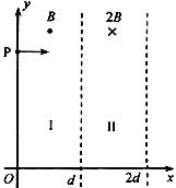 (19分)如图,在区域I(0≤x≤d)和区域II(d≤x≤2d)内分别存在匀强磁场,磁感应强度大小分别为B和2B,方向相反,且都垂直于Oxy平面。一质量为m、带电荷量q(q>0)的粒子a于某时刻从y轴上的P点射入区域I,其速度方向沿x轴正向。已知a在离开区域I时,速度方向与x轴正方向的夹角为30°;此时,另一质量和电荷量均与a相同的粒子b也从p点沿x轴正向射入区域I,其速度大小是a的1/3。不计重力和两粒子之间的相互作用力。求 (1)粒子a射入区域I时速度的大小;(2)当a离开区域II时,a、b两粒子的y坐标之差。 |