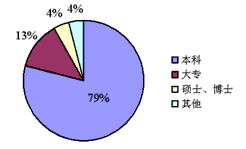 | 2006年4月11日《文汇报》报道:据不完全统计,至今上海自愿报名去西部地区工作的专业技术人员和管理人员已达3600多人,其中硕士、博士占4%,本科生占79%,大专生占13%。根据上述数据绘制扇形统计图表示这些人员的学历分布情况。 |