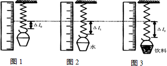 最佳答案: 答:(1)实验步骤:①将弹簧和刻度尺固定,记下弹簧末端位置;②将小桶挂在弹簧上,用刻度尺测出弹簧的伸长△l0,如图1所示;③桶中古盛满水,用刻度尺测出弹簧的伸长△l1,如图2所示;④桶中盛满饮料,用尺测出弹簧的伸长△l2,如图3所示;(2)弹簧的伸长量与它受到的拉力成正比,则