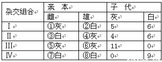 (10分)小鼠的体色灰色与白色是一对由常染色体上的基因控制的相对性状,某校生物科研小组的同学饲养了8只小鼠(编号①~⑧),同时进行了一次杂交实验。下表是杂交组合及所得第一胎子鼠的体色情况。请分析后回答问题: