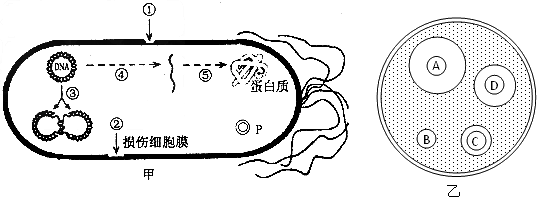 请根据下列材料和示意图回答问题材料1:医学上常使用抗生素治疗由细菌所引起的疾病。甲图简要表示不同种类的抗生素对细菌的作用部位或作用原理,如甲图中①~⑤所示。材料2:三
