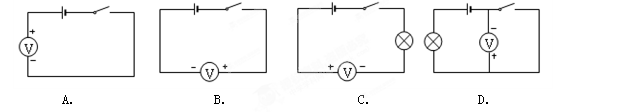 | 分析:电压表的使用规则:①电压表要并联在电路中; ②电流要从“+“接线柱流入,从“-“接线柱流出(否则指针反转). ③被测电压不要超过电压表的量程(可以采用试触的方法来看是否超过量程). A、正确; B、错误,正负极接错; C、错误,电压表应并联使用; D、错误,闭合开关后,电压表无示数. 故选A. |