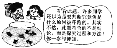 最佳答案: | (1)可以回答支持大军的观点,即鱼是被声音吓跑的。依据是声音能够在液体中传播(理论依据)或钓鱼时快要上钩的鱼儿会被岸上的说话声吓跑(事实依据)等,也可回答支持小欣的观点,即鱼是被动作吓跑的依据是当鱼在靠近河岸的水面游动时,当人伸手去抓它时(没有出声),鱼看到手的像,鱼儿却被吓跑了 (2) ①不做任何动作 ②不发出任何声音 ③如果②中鱼儿受到惊吓而①中鱼儿不受到惊吓,则表明是动作吓跑了鱼儿;又如果①与②中鱼儿都受到惊吓,则表明声音和动作都是吓跑鱼儿的原因 |