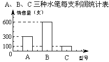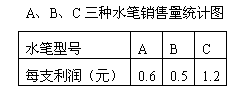 | 某文具店销售的水笔只有A、B、C三种型号,下面表格和统计图分别给出了上月这三种型号水笔每支的利润和销售量。 |