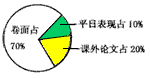 | 某校规定学生期末数学总评成绩由三部分构成:卷面成绩、课外论文成绩、平日表现成绩(三部分所占比例如图),若方方的三部分得分依次是92、80、84,则她这学期期末数学总评成绩是( ). |