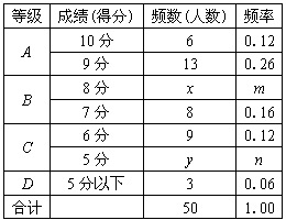 | 请你根据以上图表提供的信息,解答下列问题:(1)在统计表中x=______,y=______,m=______,n=______;(2)在扇形图中,A等级所对应的圆心角是______度;(3)如果该校九年级男生共有300名,那么请你估计这300名男生中成绩等级没有达到A或B的共有多少人? |