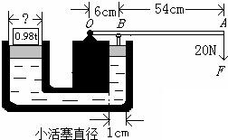 (1)如果希望在手柄A端用20N的力竖直向下压时就能在大活塞上举起0.98t的重物,求:小活塞受到的压力是多大?大活塞的直径至少是多少?