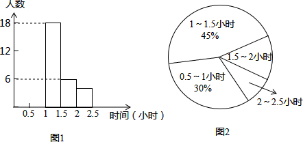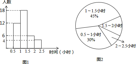 | 七年级(1)班学习委员亮亮对本班每名同学晚上完成作业的时间进行了一次统计,并根据收集的数据绘制了两幅不完整的统计图(图1、图2)请你根据图中提供的信息,解答下面的问题: (1)该班共有多少名学生? (2)将图1中的条形统计图补充完成. (3)如果七年级共有500名学生,请估计七年级学生完成作业的时间超过1.5小时的有多少学生? ![]() |