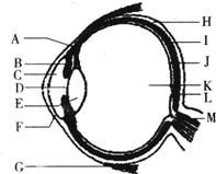 如图是人的眼球结构模式图,请据图回答第4~6题.中国人是黄皮肤黑眼睛,欧州人是白皮肤蓝眼睛,决定眼球颜色的结构是()A.BB.CC.ED.K