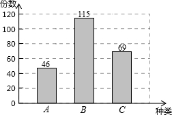 小明参加卖报纸的社会实践活动,他调查了一个报亭某天A,B,C三种报纸![]() 的销售量.并把调查结果绘制成如下条形统计图. (1)求该天A,C报纸的销售量各占这三种报纸销售量之和的百分比; (2)请绘制该天A,B,C三种报纸销售量的扇形统计图; (3)小明准备按上述比例购进这三种报纸共100份,他应购进这三种报纸各多少份? |