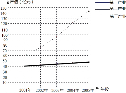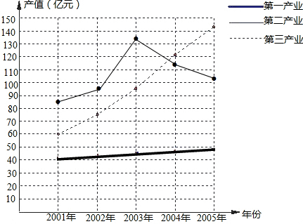 下列是某市2001年到2005年第一、第二、第三产业产值的统计情况.年份2001年2002年2003年2004年2005年第一产业产值(亿元)42.144.145.346.447.2第二产业产值(亿元