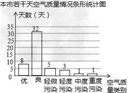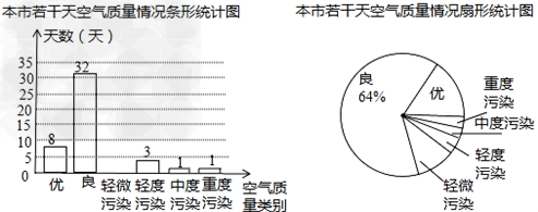 最佳答案: 解:(1)∵扇形图中空气为良所占比例为64%,条形图中空气为良的天数为32天,∴被抽取的总天数为:32×64%=50(天);(2)轻微污染天数是50-32-8-3-1-1=5天;表示优的圆心角度数是 360°=57.6°,如图所示: (3)∵样本中优和良的天数分别为:8,32,∴一年(365天)达到优和良的总天数为: ×365=292(天).∴估计该市一年达到优和良的总天数为292天. |