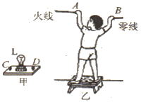 “元旦文艺会演”时,物理老师和电工师傅合作给同学们表演了一个“不怕电”的节目(注意:因该节目有危险,同学们切勿模仿)。首先电工师傅将两根导线的接头A、B分别连接到一标有“P 2220 100”的灯泡(如图甲所示)的接线柱C、D上,闭合开关,灯泡正常发光。随后,电工师傅断开开关,取下灯泡,物理老师站到干燥的木凳上,左、右两手分别抓住两导线接头A、B(如图乙所示),此时电工师傅闭合开关,用测电笔分别测试导线接头A、B及物理老师的皮肤,发现测电笔的氖管均发光,而在这一过程中,物理老师依然谈笑自如。对以上现象的解释,你认为下列说法中正确的是( ) A.物理老师有“特异功能”,确实不怕电 B.物理老师的双手戴着绝缘手套 C.在人、灯替换的过程中,电源的零线被断开了 D.在人、灯替换的过程中,电源的火线被断开了 |