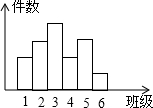 在学校开展的小制作评比活动中,二年级六个班都参加了比赛,根据他们上交作品的件数,绘制直方图如右.![]() 已知从左至右各长方形高的比为2:3:4:2:3:1,小制作件数最多的三班上交了16件.经评选各班获奖件数如右表: