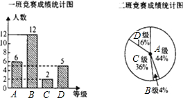 在学校组织的“中华人民共和国建国60周年”的知识竞赛中,每班参加比赛的人数相同,成绩分为A,B,C,D四个等级,其中相应等级的得分依 次分为100分,90分,80分,70分,学校将某年级的一班和二班的成绩整理并绘制成如图的统计图:请你根据以上提供的信息解答下列问题:(1)请你将表格补充完整: | 平均数(分) | 中位数 | 众数 | | 一班 | 87.6 | 90 | | | 二班 | 87.6 | | 100 | (2)请从下列不同角度对这次竞赛成绩的结果进行分析,哪个班的成绩更好:①从平均数和中位数的角度来比较一班和二班的成绩;②从平均数和众数的角度来比较一班和二班的成绩;③从B级以上(包括B级)的人数的角度来比较一班和二班的成绩.(3)若从一班和二班的所有参赛同学中,随机抽取一名同学的成绩,则抽到同学的成绩在C级以上(包括C级)的概率是多少? |