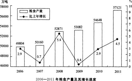 2011年,我国全年粮食种植面积11057万公顷,比上年增加70万公顷;棉花种植面积504万公顷,增加19万公顷;油料种植面积1379万公顷,减少10万公顷;糖料种植面积195万公顷,增加4万公顷。全国全年粮食产量57121万吨,比上年增加2473万吨,增产4.5%。其中,夏粮产量12627万吨,增产2.5%;早稻产量3276万吨,增产4.5%;秋粮产量41218万吨,增产5.1%。