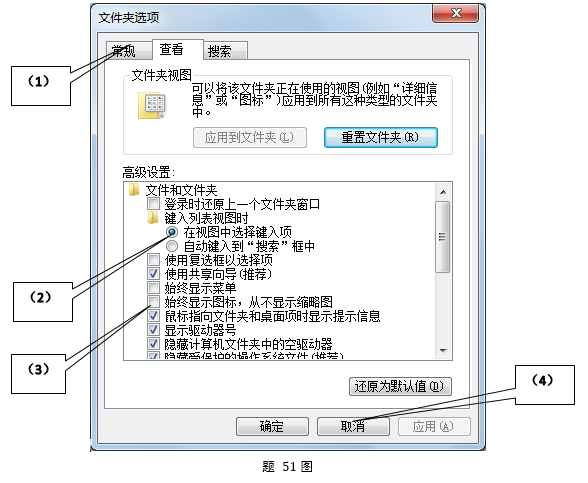 [问答题,材料题,分析] (简答题)如题51图所示,写出"文件夹选项”对话框中做标记的元素名称。