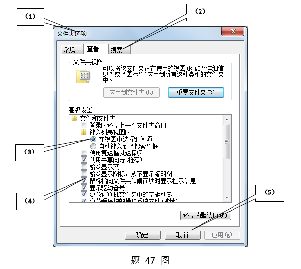 [问答题,材料题,分析] (简答题)Windows 7对话框由多个部分组成,写出如题47图所示文件夹选项对话框指定的5个部分的名称。