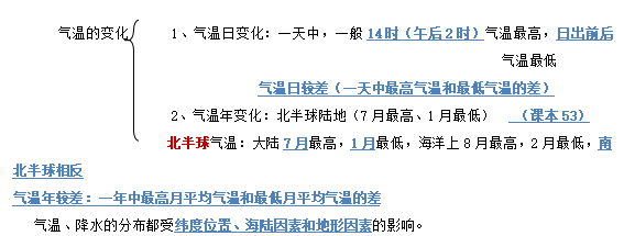 | 海陆因素 | 夏季陆地气温高于海洋,冬季海洋气温高于陆地 | 中纬度地区沿海多于内陆;南、北回归线附近大陆西岸和内陆降水少,大陆东岸降水多 |