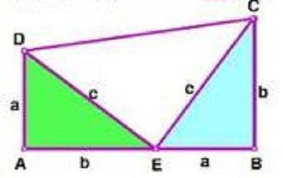以a、b为直角边,以c为斜边,作两个全等的直角三角形,则每个直角三角形的面积等于1/2ab。把这两个直角三角形拼成如图所示形状,使A、E、B三点在一条直线上。