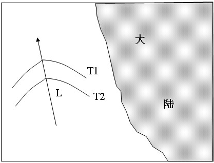 (2007•海南)如图所示区域在28°S附近,L示意流经沿岸的洋流.完成下列要求.(1)在图中用箭头表示洋流L的流动方向.(2)在图示海域画两条过洋流L的等温线,分别标注T1和T2,其温度