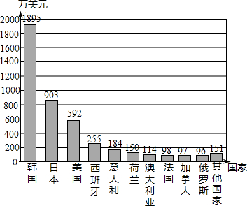 2008年5月30日,国务院关税税则委员会决定从当天起对纺织品出口关税作出进一步调整,对一些纺织品取消征收出口关税.在此背景下,某报报道了2008年1~4月份某市服装对外出口的情况,并绘制统计图如下:请你根据统计图中提供的信息,回答下列问题:(1)2008年1~4月份,该市服装企业出口额较多的是哪两个国家?(2)2008年1~4月份,该市服装企业平均每月出口总额是多少万美元?![]() |