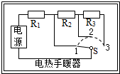 最佳答案: (1)当开关接“3”时,电阻R1、R2、R3串联,此时电路的总电阻最大,电热暖手器工作时的电流最小,即I=