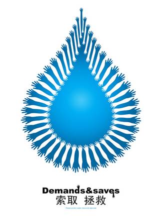 构图要素:由一滴水,和水滴外一圈伸向水滴白色的手臂,向外寻找深色手臂构成,画面下方有说明性文字“索取 拯救”寓意:形象的提示人们对日益减少的水资源(及其他资源)要采取的做法,是仍然挥霍无度,一味索取,让最后一滴水消失,还是保护,调整方向,向外寻找?寻找或许会拯救人类生命必需的水资源。
