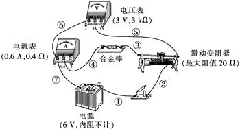 (1)测量该合金棒电阻的实物电路如图所示(相关器材的参数已在图中标出),该合金棒的电阻约为几个欧姆.图中有一处连接不当的导线是________(用标注在导线旁的数字表示)。