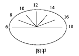 某学校(110°E)地理兴趣小组用立竿测影的方法确定地方时刻。如图甲在自制刻有钟点时间的圆盘中心垂直竖立一根高为20厘米的标杆,7条放射线段是在某日每隔2小时记录的标杆阴影方向