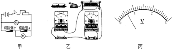 | (9分)为了防止电路中电流过大,发生危险,电路中常常需要安装保险丝.通常保险丝电阻比较大、熔点比较低,当电路中通过保险丝的电流达到或超过其熔断电流时保险丝就会熔断,从而切断电路.保险丝安装在玻璃管中,称为保险管. 实验室有熔断电流分别为1A和4A的两种保险管,保险管上印刷的文字已经模糊不清,但小明知道:熔断电流较大的保险丝,其电阻较小,因此,小明设计了如图甲所示实验电路图,想通过比较它们的电阻大小来区别这两种保险管. (1)根据图甲电路图,在图乙的实物图中,用笔代替导线把电源接入电路. (2)连接好电路之前,开关应保持 ????? (选填“闭合”或“断开”). (3)若想用此电路测出各保险管的具体电阻值,还缺一实验仪器: ??????? . (4)在图甲中,若电压表V2的读数为2.7V,电压表Vl读数如图丙所示,则保险管A两端的电压为 ??? V,保险管B两端的电压为 ????? V. (5)根据测量数据可知:保险管A的熔断电流为 ???? A. (6)将这两个保险管并联接入某一电路中,当电路中的电流达到 ????????? A时,保险管将熔断. |