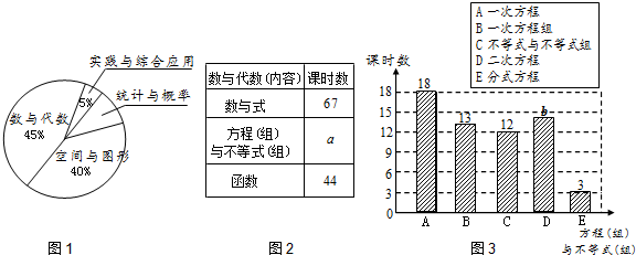 | 初中阶段数学内容总课时为380课时,教学结束后,唐老师计划安排60课时用于总复习.唐老师根据数学内容所占课时比例,绘制如下统计图表(图1~图3),请根据图表提供的信息,回答下列问题: (1)图1中“统计与概率”所在扇形的圆心角为度; (2)图2、图3中的a=______,b=______; (3)总复习中,唐老师应安排“数与代数”和“空间与图形”各多少课时复习? ![]() |
