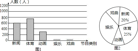 电视台在南充城市某居民小区对电视节目的收视情况进行抽样调查,每人只能在被调查的五类电视节目中选择一类“最喜欢”的电视节目,将统计结果绘制了两幅不完整的统计图.请根据图中信息解答问题:(1)这次抽样调查了多少人?(2)在扇形统计图中,最喜欢娱乐节目对应的圆心角比最喜欢戏曲节目对应的圆心角大90°,调查中最喜欢娱乐节目比最喜欢戏曲节目的多多少人?(3)估计南充城区有100万人中最喜欢体育节目的有多少人?![]() |