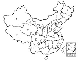 | (1)图中字母所代表的省级行政区的简称分别是: A__________,B__________,C__________,D__________; E__________,F__________,G__________,H__________; J__________,K__________,M__________,N__________。 |