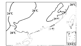 2.此时沿图中海岸线分布的28°C等温线自南向北观察到的现象,最可信的是( )