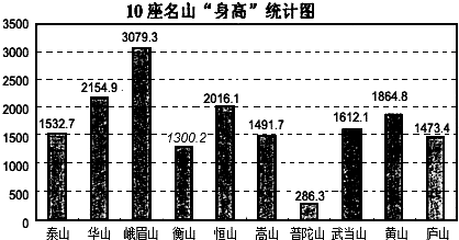 今年4月底,国家测绘局和建设部首次为我国19座名山定“身高”(单位:m).下图为其中10座名山的“身高”统计图.请你根据图中提供的信息回答下列问题: (1)这10座名山“身高”的极差和中位数分别是多少?(2)这10座名山“身高”在1000m到2000m之间的频率是多少?(3)这10座名山中,泰山、华山、衡山、恒山、嵩山并称“五岳”,求“五岳”的平均“身高”. |