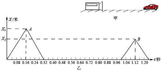 交通部门常用测速仪来检测车速。测速原理是测速仪前后两次发出并接收到被测车反射回的超声波信号,再根据两次信号的时间差,测出车速,如图甲。某次测速中,测速仪发出与接收超声波的情况如图乙所示,x表示超声波与测速仪之间的距离。则该被测汽车速度是(假设超声波的速度为340米/秒,且保持不变)
