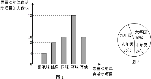 某九年级制学校围绕“每天30分钟的大课间,你最喜欢的体育活动项目是什么?(只写一项)”的问题,对在校学生进行随机抽样调查,从而得到一组数据.图1是根据这组数据绘制的条形统计图,请结合统计图回答下列问题:(1)该校对多少学生进行了抽样调查?(2)本次抽样调查中,最喜欢篮球活动的有多少?占被调查人数的百分比是多少?(3)若该校九年级共有200名学生,图2是根据各年级学生人数占全校学生总人数的百分比绘制的扇形统计图,请你估计全校学生中最喜欢跳绳活动的人数约为多少? |