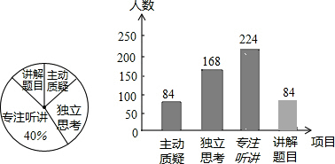 某市对教师试卷讲评课中学生参与的深度和广度进行评价,其评价项目为主动质疑、独立思考、专注听讲、讲解题目四项.评价组随机抽取了若干名初中生的参与情况,绘制了如下两幅