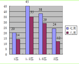 (2)根据统计图回答下面问题. ①那个月份空调的销售量好? ②规格为2匹的空调七月份的销售量是八月份的几倍? ③规格为1.2匹的空调平均每月销售量是多少台? ④从统计图中你还得到哪些信息?如果你是商店的经理,明年进货时有何打算? |