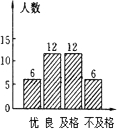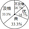 最佳答案: | 从条形统计图中得出各等级的人数分别为:优:6人,良:12人,及格:12人,不及格:6人, 得优的人数占的比例=6÷36=